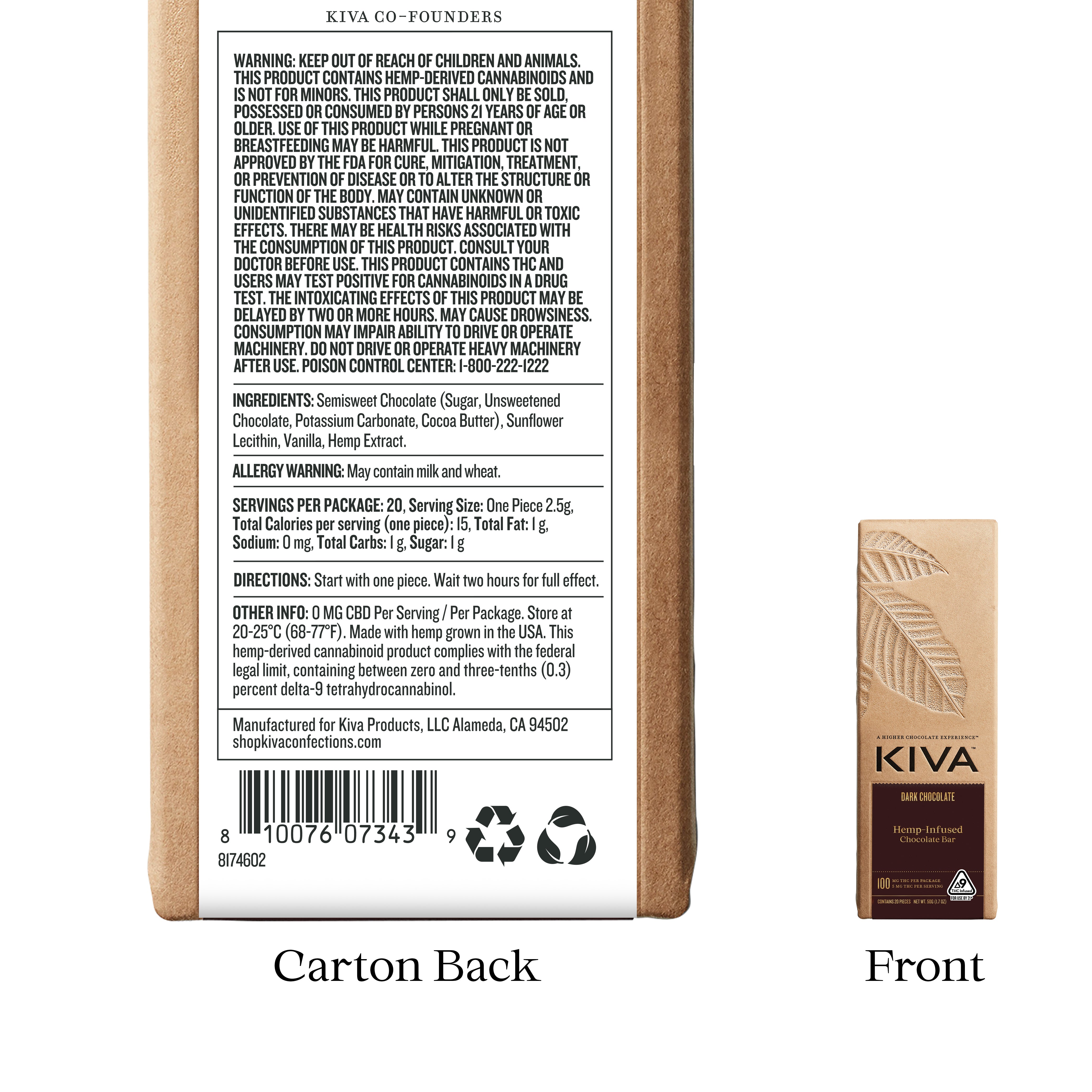 Indulge in the timeless pleasure of Kiva Dark Chocolate. Silky, rich, and irresistibly smooth, each square invites you to slow down, savor, and delight in the moment. Crafted from premium sustainably-sourced cacao and infused with hemp-derived THC, this bar enhances everyday moments with the gentle relaxation and lifted mood that so many of us seek. Whether you’re sharing it with someone special, stirring it into a cup of warm cocoa, or simply enjoying a quiet moment to yourself, each 5MG THC piece delivers a deliciously precise experience- proving that chocolate and hemp truly are the perfect pair.